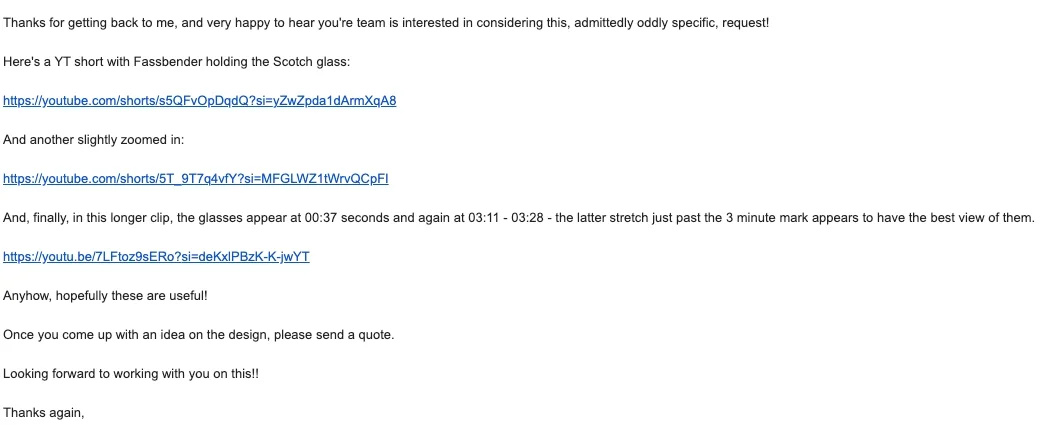 To guide the process, the client sent us reference material: YouTube clips with timestamps showing the glasses in Michael Fassbender’s hand during the scene.